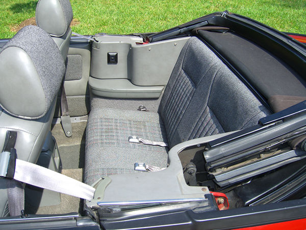 I installed two unusual child seats in the back of the Mustang for my two children, aged 4 and 6 when I bought it. Pre-1990 Mustangs have no rear shoulder belts, just lap belts, so conventional booster seats don't work. Old "shield" style seats are very dangerous, and strapping your child in with just a lap belt is neither legal nor safe. No one makes a retrofit shoulder belt kit for the 1989 convertible to address this problem. So I purchased the two special seats. One is the nifty Britax Laptop, which I purchased on eBay for a rather large sum (it's discontinued). The price I had to pay shows that there's an unmet need for booster seats that work with older cars. The Laptop works for kids up to 65 pounds. The other car seat was a Britax Husky, a sort of giant infant seat for kids up to 80 pounds. I prefer the Laptop because it keeps the child low in the seat (it fits over the child, not under). Note that two Husky seats can't fit side by side in a Mustang convertible, but the Laptop fits next to the Husky. Unfortunatley the rear seat passengers have little protection against cigarette butts and anything thrown out of someone else's window on the highwy. So I kept the top up when driving on fast roads with the kids. But in fact I didn't drive with the kids in the car too often.