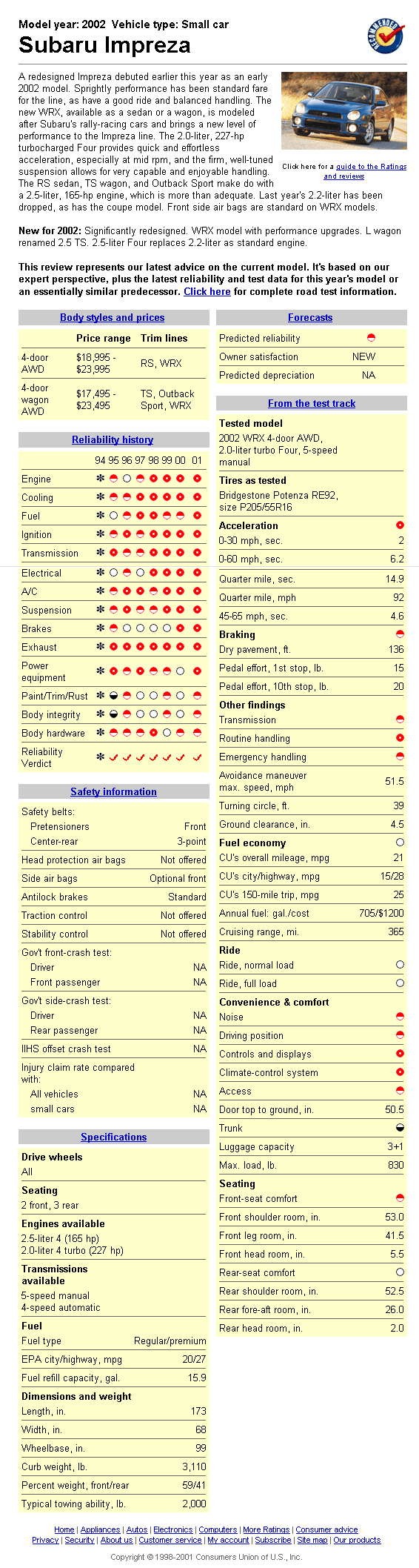 The base Impreza has a starting price of $17,500 (making it the least expensive AWD car on the market). The WRX sedan begins at $23,995, which includes standard features such as antilock brakes, side air bags, a six-disc in-dash CD changer, and all the usual power accessories. The total price for our car, including shipping, came to $24,545. The CR Wholesale Price, which includes buyer rebates and what the dealer paid after incentives, is $22,502. (CR Wholesale Prices were effective as of early October 2001.)